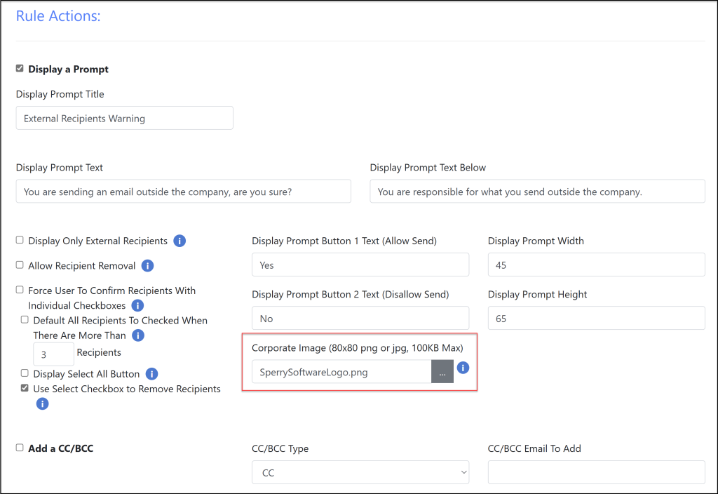 The corporate image upload is found in the rule actions (and is applied per rule):