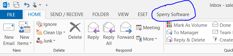 Because the add-ins are integrated into Outlook, and become part of Outlook, they can be found in Outlook. Just look for the Sperry Software tab in the main Outlook window: