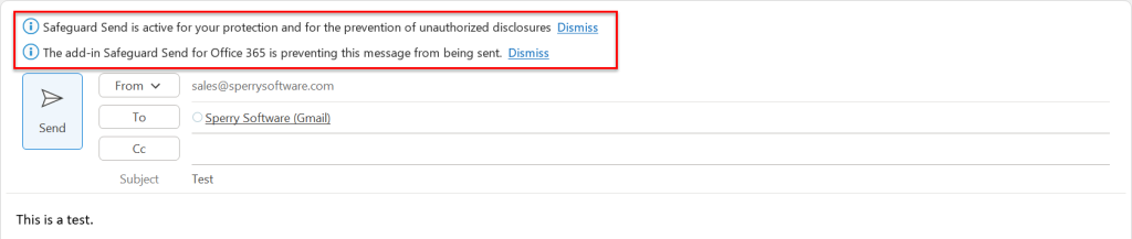 Message To Display: This is the message displayed when the Prevent the Email From Sending option is checked. Because there may be no prompt associated with this rule, the text here will show up as a tooltip in the body of the email. The default text is “Safeguard Send is active for your protection and for the prevention of unauthorized disclosures.”. Here is what it looks like in Outlook, as an attempt to send to a Gmail address is stopped: